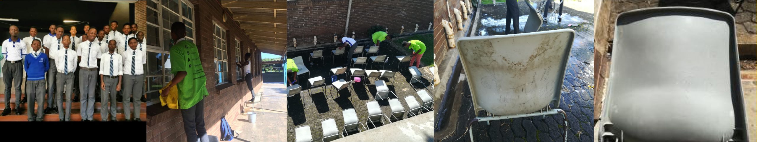 The 2021 Grade 11 Courteous Boys have embarked on a cleaning program in respect of the classrooms. They started with the cleaning of chairs for learners and the windows of the building.